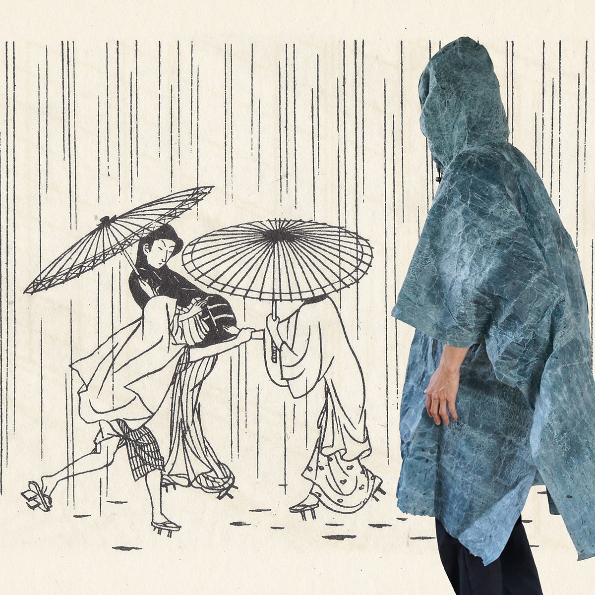 楮を藍染して漉いた大きな藍染和紙に、蜜蝋を溶かし塗ってポンチョにした。