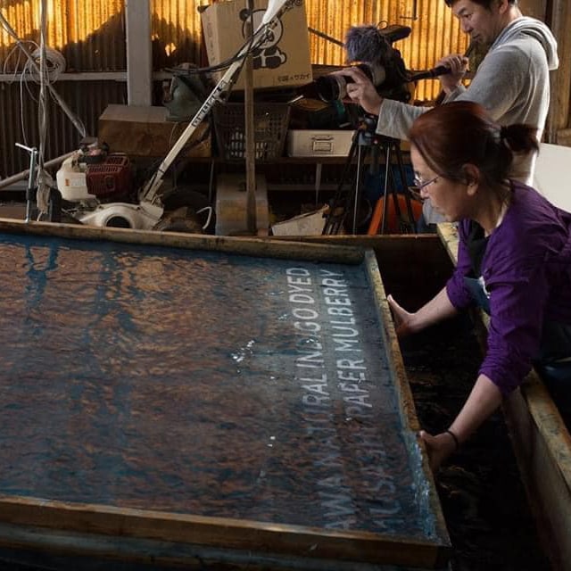 埼玉県でコウゾを育て、和紙を漉いている谷野裕子さん。徳島県でアイを育て、藍染をしている渡邉健太さん。二人に依頼したのは楮を藍で先染し、手漉き和紙にすること。完成したのは1.4X2.0メートルという巨大な藍染和紙だった。